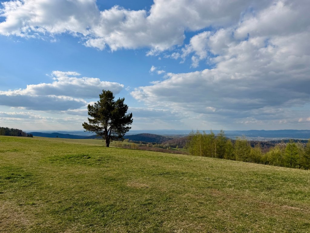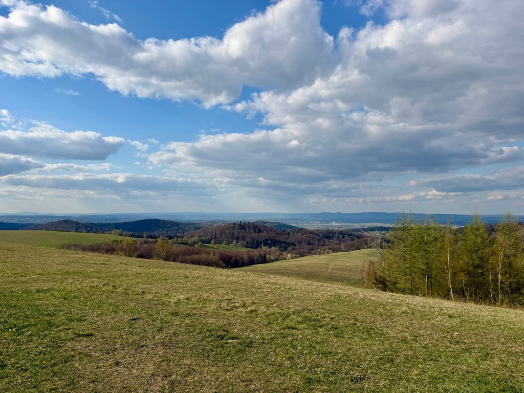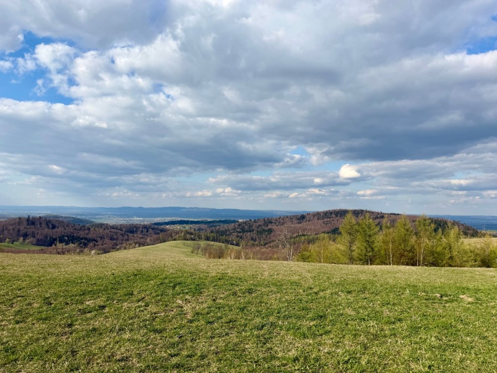 Spacerujemy po wzniesieniu. Z jednej strony widać miasto, z drugiej wioskę. Dalej ciągną się pasma wzgórz, zalesione szczyty, pola poprzeplatane drogami.