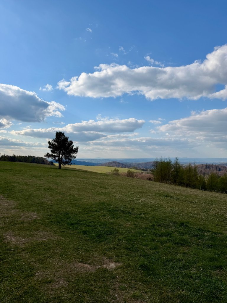 Naszą uwagę przykuwa jedno, niskie drzewo. Stoi trochę samotnie, idealnie wpisane w krajobraz, góry, doliny, chmury. To jedno z tych miejsc, które aż się proszą o zdjęcie. I o chwilę zatrzymania.