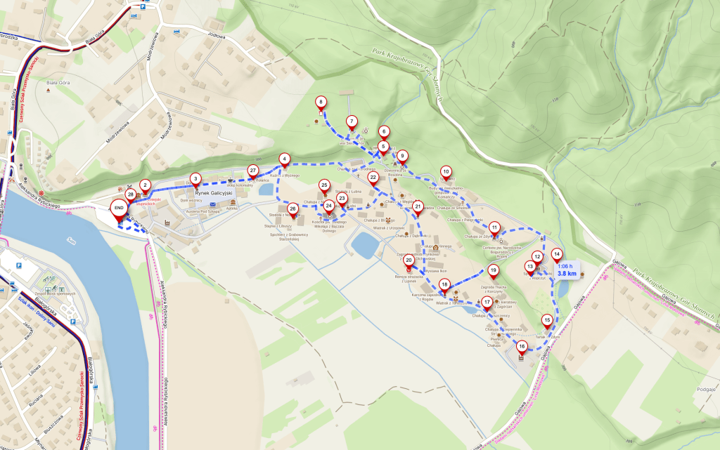 Trasa: Parking – Z parkingu przechodzimy przez bramę i kierujemy się do budynku po prawej gdzie znajdują się kasy. Kasa samoobsługowa znajduje się przed budynkiem a bramki na prawo od budynku – Zwiedzanie zaczynamy od zwiedzaniach rynku Galicyjskiego – Trzymając się lewej strony przechodzimy do strefy poświęconej Bojkom – Następnie idziemy w lewo pod górę do sektora pasterskiego – Wracamy tą samą drogą na dół a następnie dalej trzymając się lewej strony przechodzimy do sektora Łemkowskiego – Za nim znajduje się dwór z parkiem – Za stawem znajdują się ziemianki – Kierując się drogą dochodzimy do sektora prezentującego wydobycie nafty – Przechodząc dalej mijamy zabudowania Dolinian i Przedgórzan – Wracamy na rynek i opuszczamy muzeum – Parking