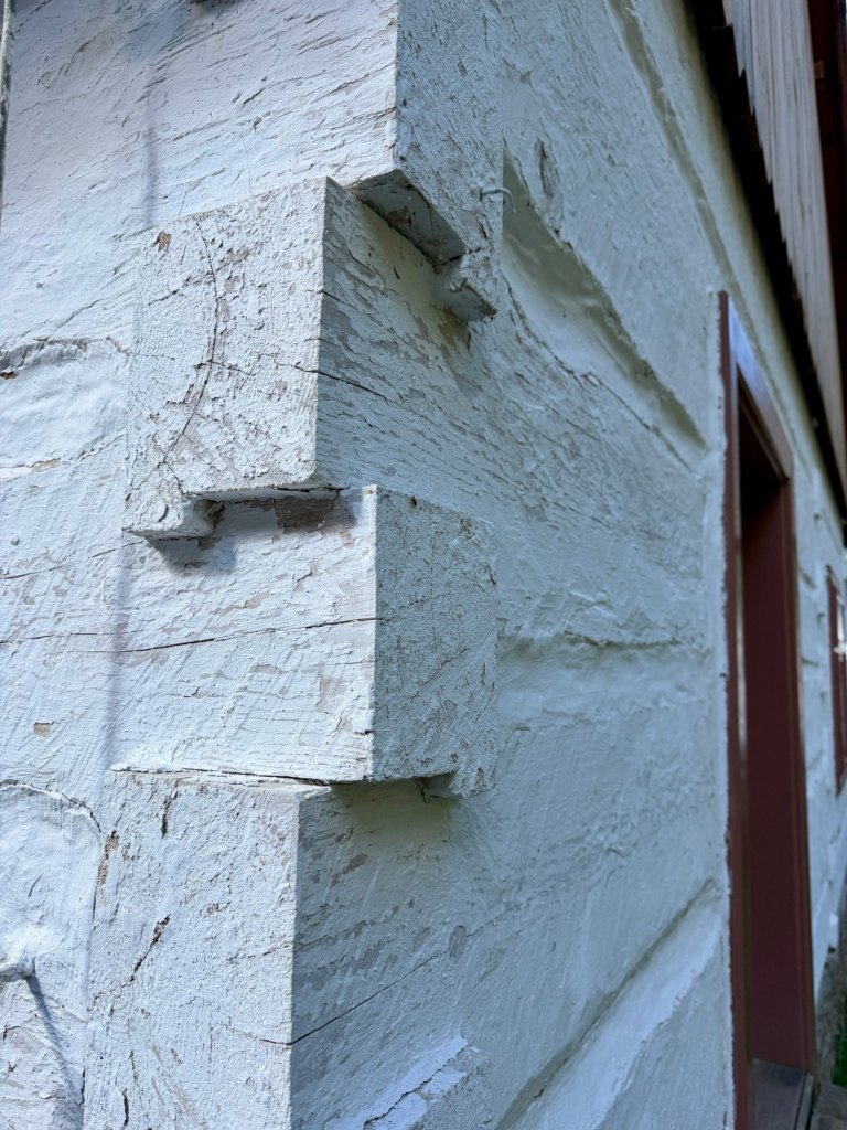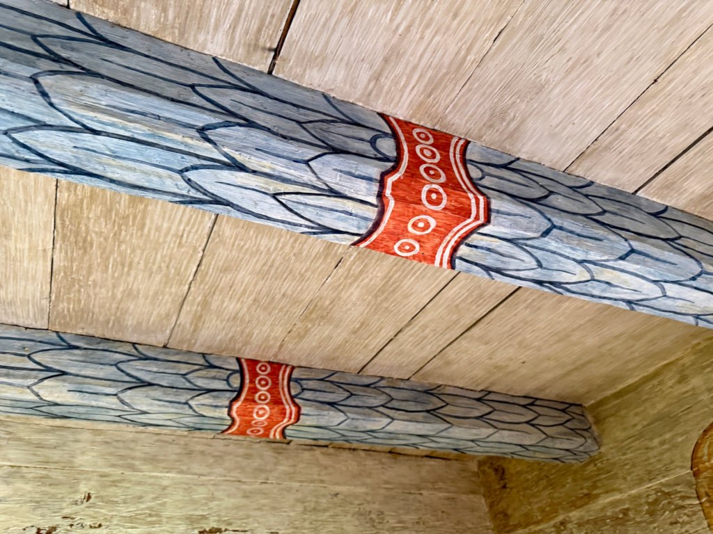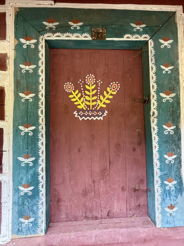 Zabudowania są zupełnie inne, chyże zdobione są charakterystycznymi malunkami, niebieskie wzory otaczają drzwi i okna, a inne chaty mają białe pasy na ciemnym drewnie.