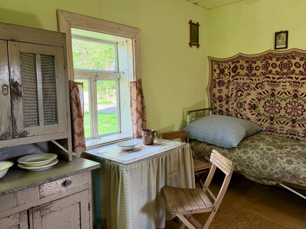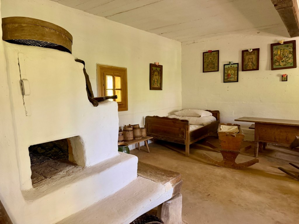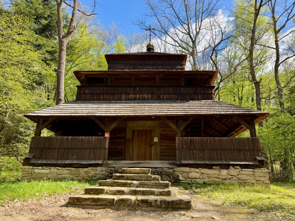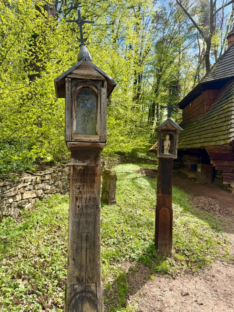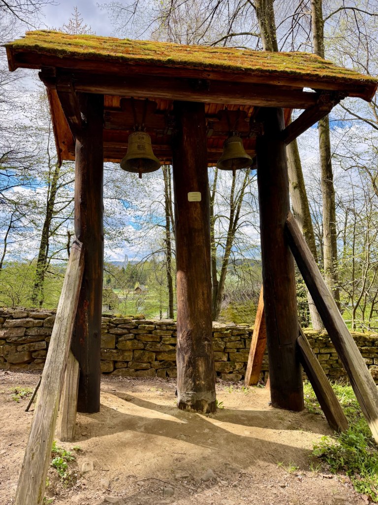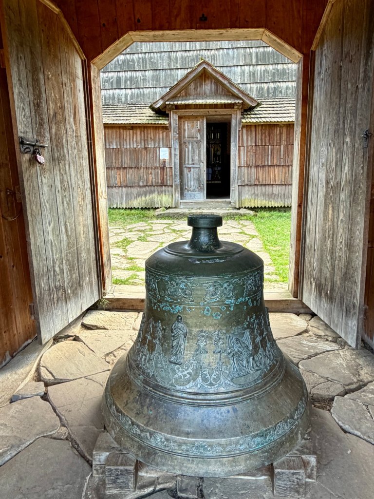 Zaglądamy przez okna, starając się zobaczyć jak najwięcej. Obok zagród biegnie droga krzyżowa, a w pobliżu stoi cerkiew z dzwonem, co ciekawe ustawionym w bramie na ziemi, by można było zobaczyć jego zdobienia. Do środka cerkwi też można zajrzeć przez kratę.