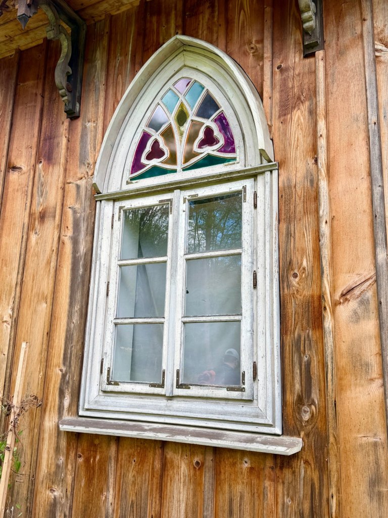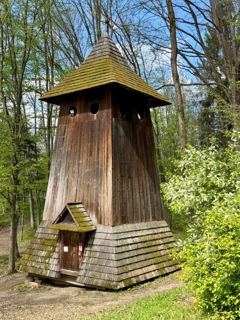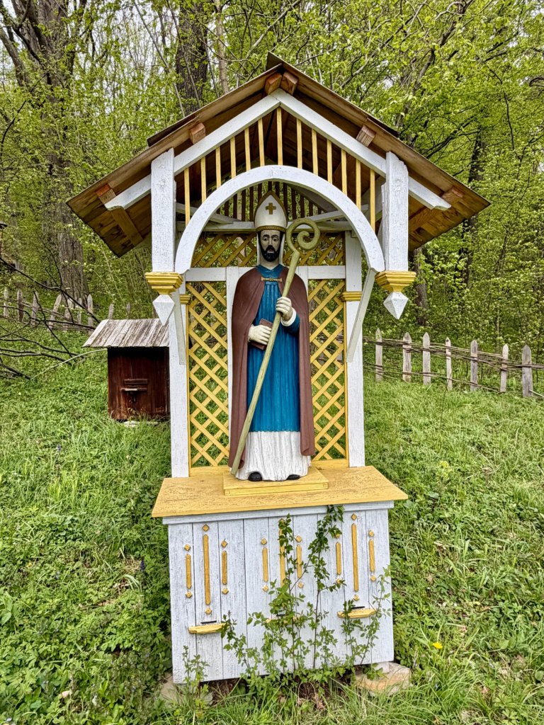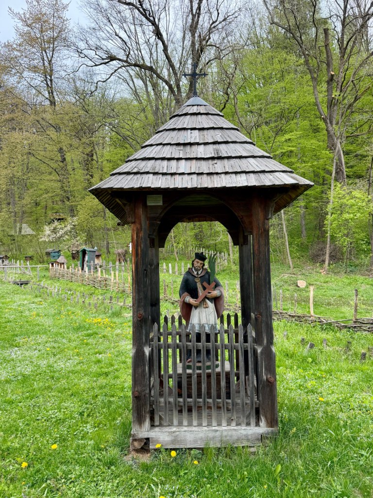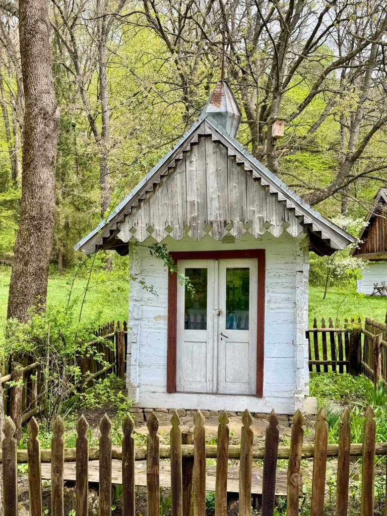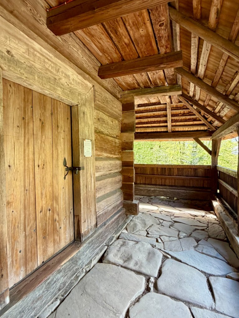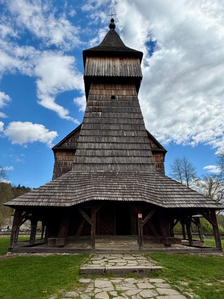 Zaglądamy przez okna, starając się zobaczyć jak najwięcej. Obok zagród biegnie droga krzyżowa, a w pobliżu stoi cerkiew z dzwonem, co ciekawe ustawionym w bramie na ziemi, by można było zobaczyć jego zdobienia. Do środka cerkwi też można zajrzeć przez kratę.