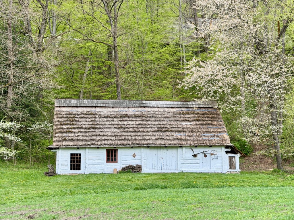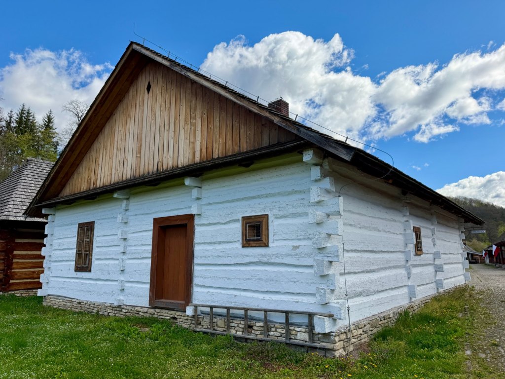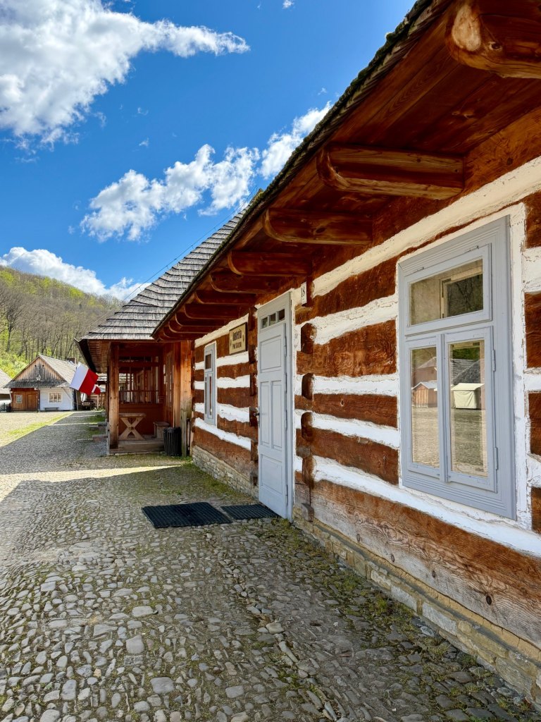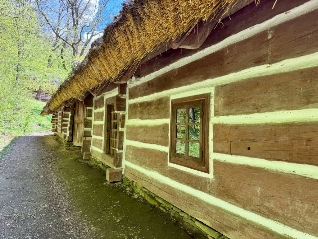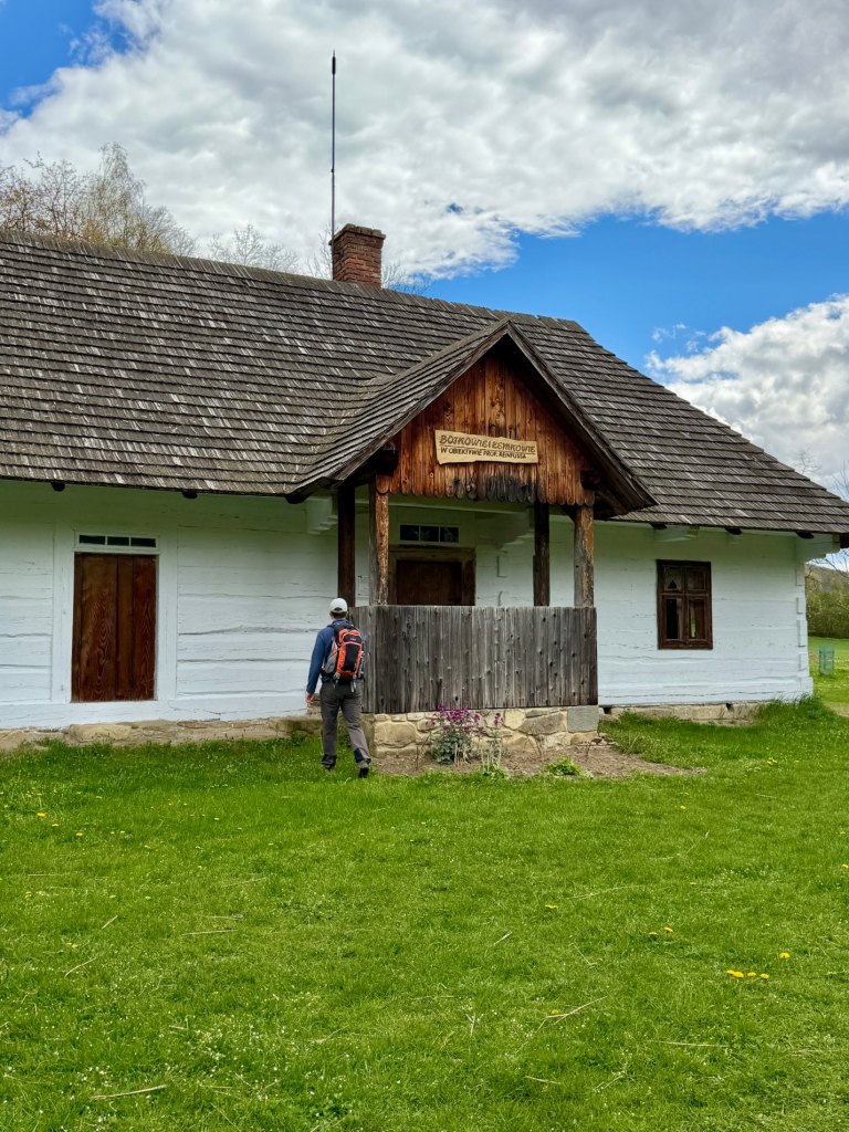 Z rynku schodzimy na węższą ścieżkę prowadzącą przez zieleniący się lasek. Czuć młode pokrzywy, powietrze jest świeże, a mimo wiatru robi się bardziej przyjemnie i spokojnie. Dochodzimy do zabudowań bojkowskich, gdzie zaglądamy do zagrody, wnętrze jest bardzo proste, wręcz surowe, i daje wyobrażenie o codziennym życiu.