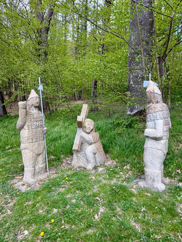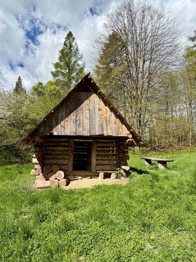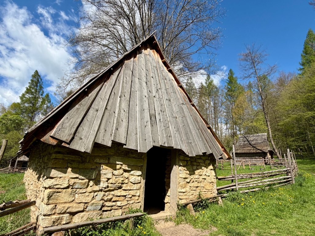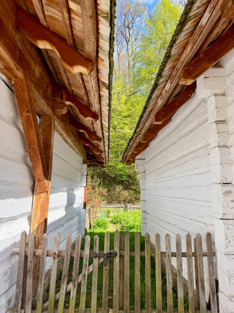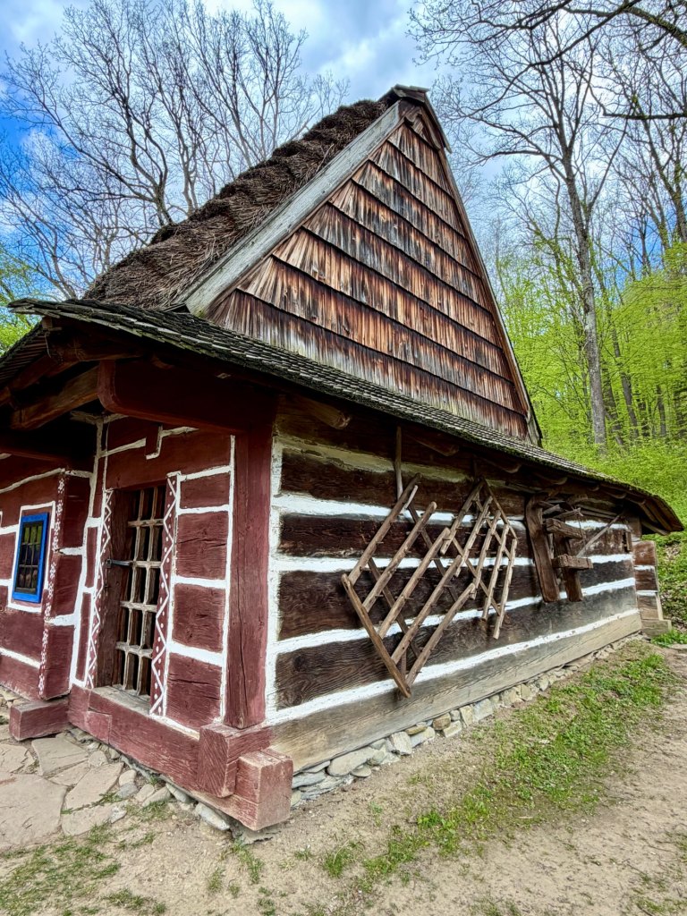 Z rynku schodzimy na węższą ścieżkę prowadzącą przez zieleniący się lasek. Czuć młode pokrzywy, powietrze jest świeże, a mimo wiatru robi się bardziej przyjemnie i spokojnie. Dochodzimy do zabudowań bojkowskich, gdzie zaglądamy do zagrody, wnętrze jest bardzo proste, wręcz surowe, i daje wyobrażenie o codziennym życiu.