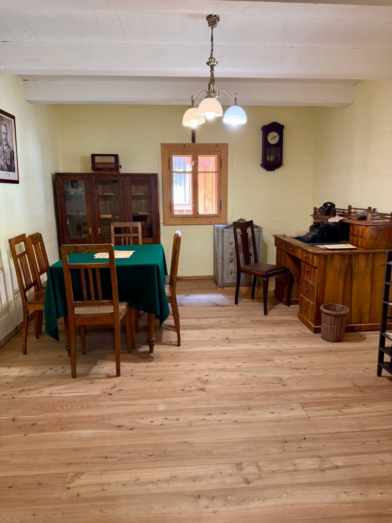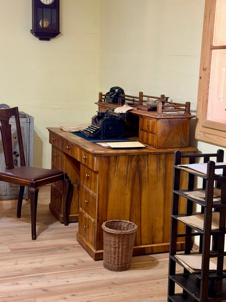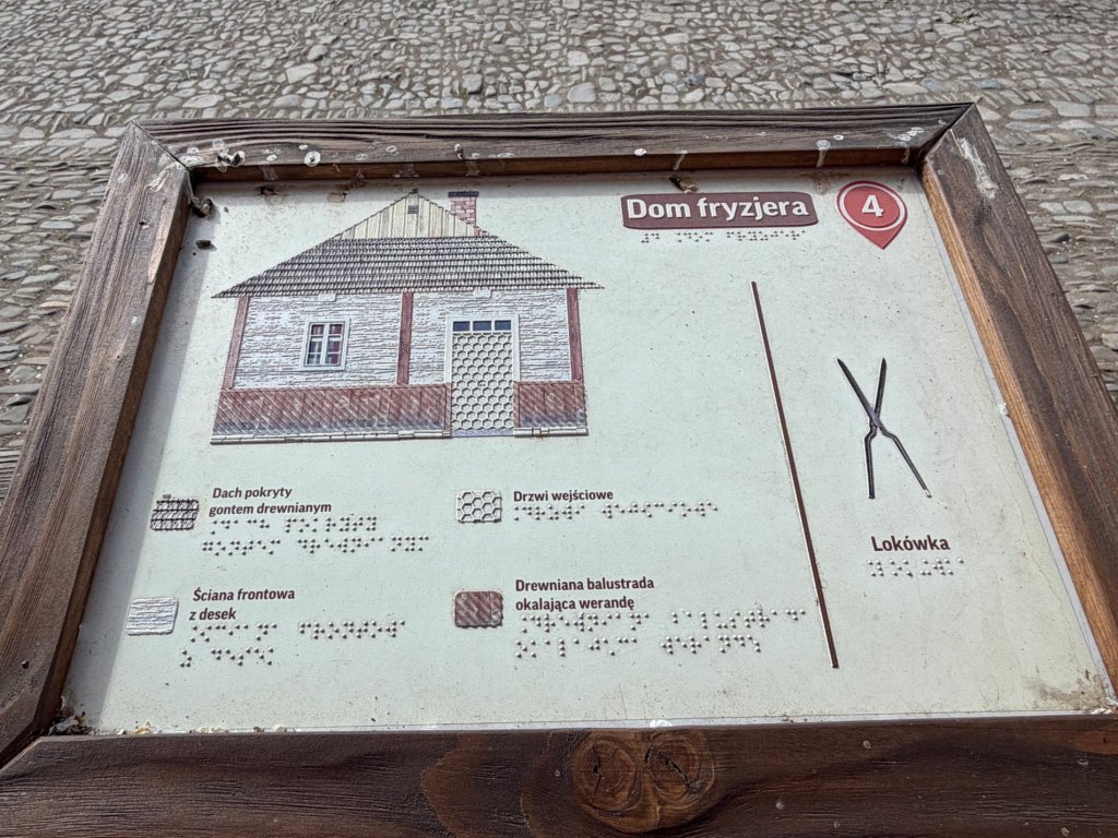 Większość budynków jest zamknięta, ale do kilku można zajrzeć przez okna. Mijamy zakład fryzjerski, krawiecki, dom nauczyciela, zegarmistrza, fotografa, aptekę, urząd gminy, pocztę, szewca, karczmę, a dalej nawet kręgielnię, która zupełnie nas zaskakuje swoją obecnością. Są też domy mieszkalne, w tym żydowskie, z małymi ogrodzonymi posesjami, wychodkami i detalami, które sprawiają, że można się przy nich zatrzymać na dłużej.