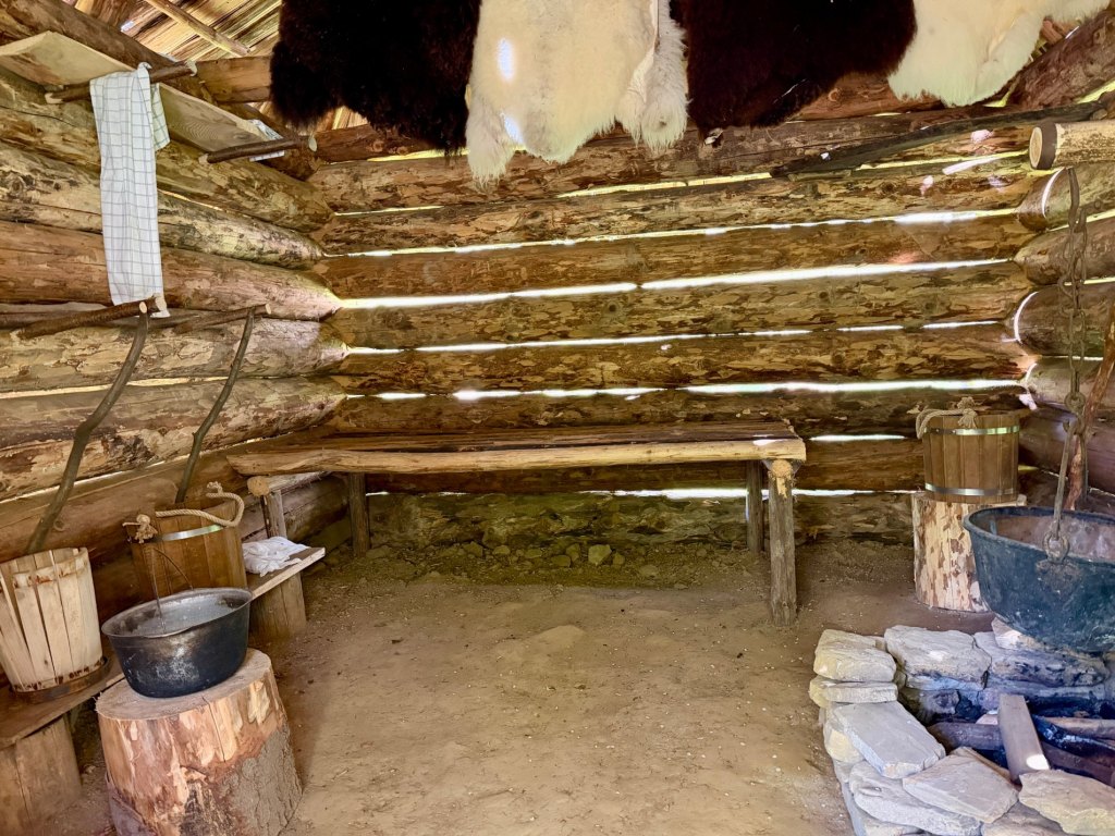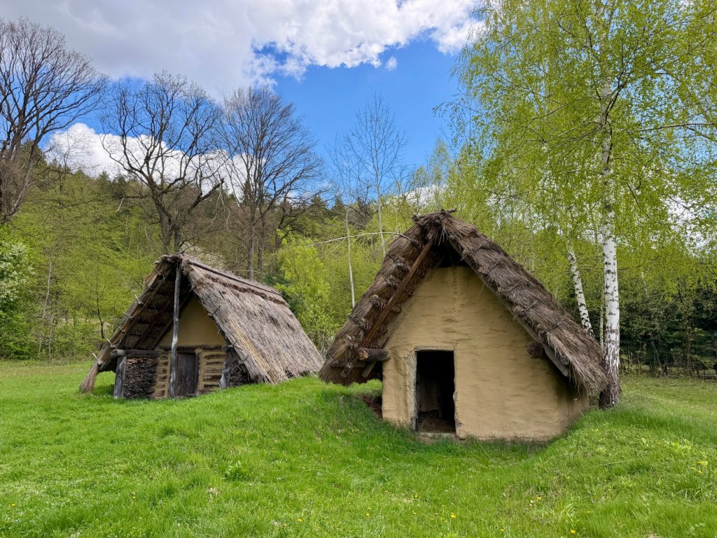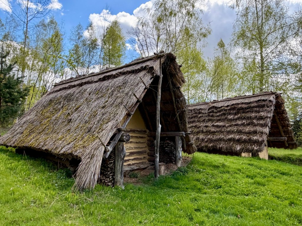 Przy stawie trafiamy na dwie półziemianki, do których można wejść i zobaczyć ich wnętrze. Od razu kojarzą nam się z grodziskiem w Żmijowiskach, które odwiedziliśmy wcześniej.