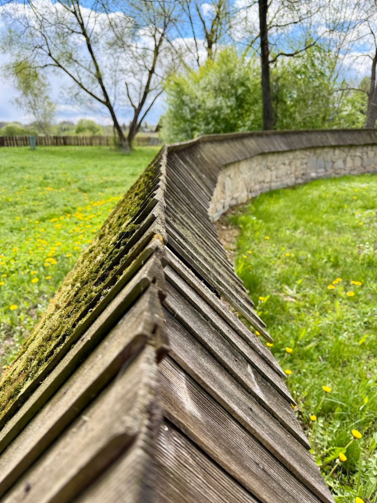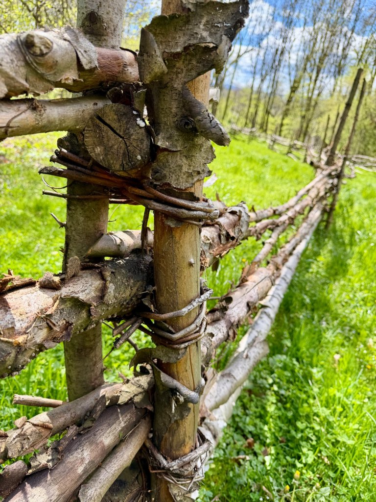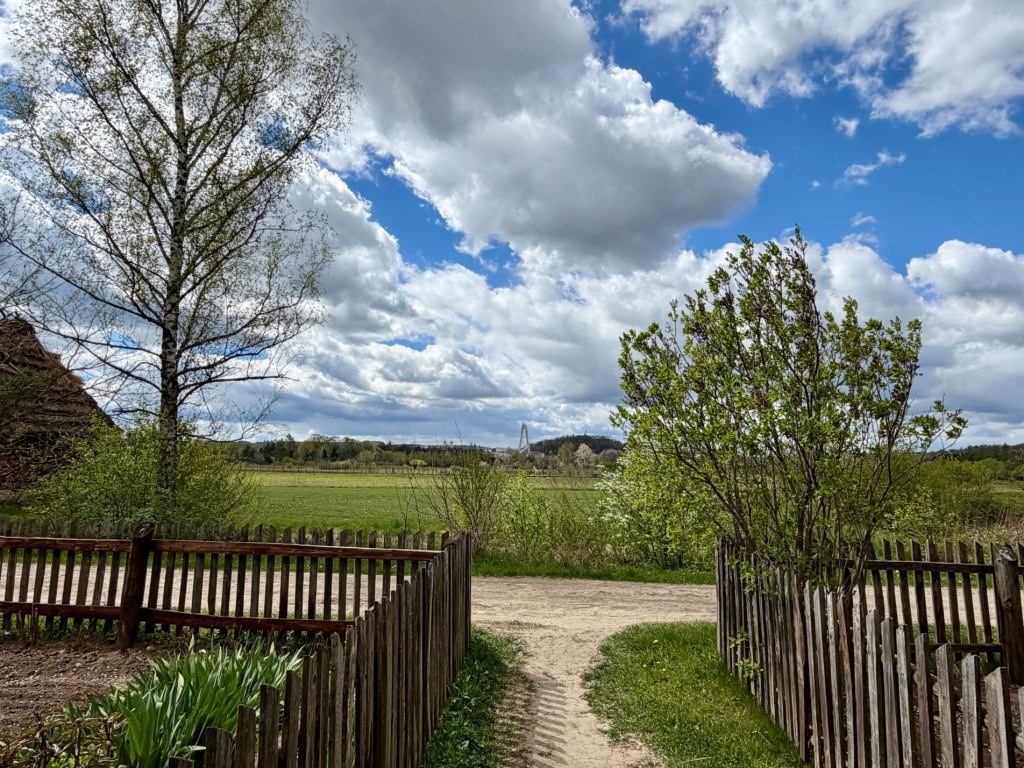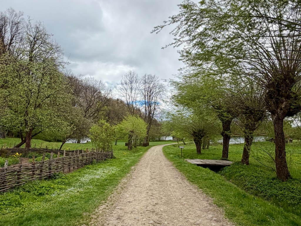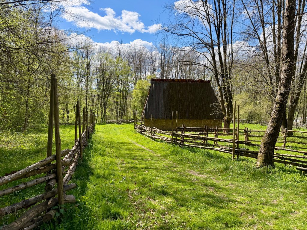 Kolejna część jest jeszcze bardziej zielona, trawa jest soczysta, miejscami pokryta rosą. Pojawiają się niskie chaty z plecionymi ogrodzeniami, proste i jasne, które mocno odcinają się od intensywnej zieleni wokół. Jest tu cicho i spokojnie, a na chwilę wychodzi słońce i robi się naprawdę przyjemnie. To jedno z tych miejsc, gdzie można się zatrzymać i wyobrazić sobie owce i kozy pasące się na trawie.