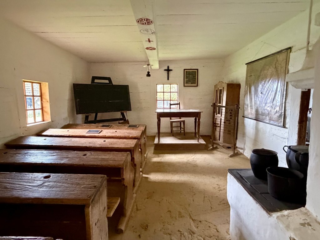 Ostatni sektor zwiedzamy już szybciej. Jest tu wiatrak, szkoła wiejska, chałupy i zagrody jednobudynkowe. Na chwilę wychodzi słońce, zaglądamy jeszcze do kościoła i idziemy dalej.