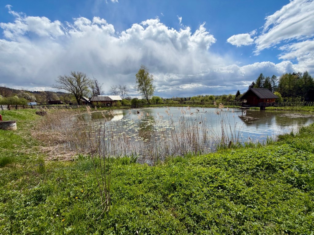 Zaglądamy do piekarni, która jako jedna z niewielu działa naprawdę. W środku są drożdżówki, chleby i różne wypieki, więc kupujemy paluchy i na chwilę zatrzymujemy się przy stawie obok, żeby je zjeść. Wiatr nas szybko przegania.