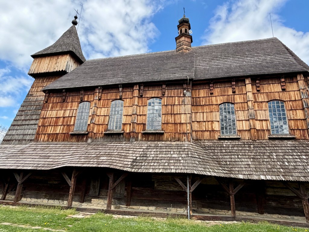 Pod nogami nierówne kocie łby, bruk w różnych odcieniach, który dodatkowo podkreśla klimat miejsca. Patrzymy na drewnianą architekturę, zdobione fronty domów, strzeliste dachy i kolumny, zaglądamy do ogródków, które na razie są jeszcze puste, bez kwiatów. Synagoga drewniana, stojąca nieco z tyłu rynku robi duże wrażenie swoją bryłą, choć niestety jest zamknięta, podobnie jak remiza ze sprzętem w środku.