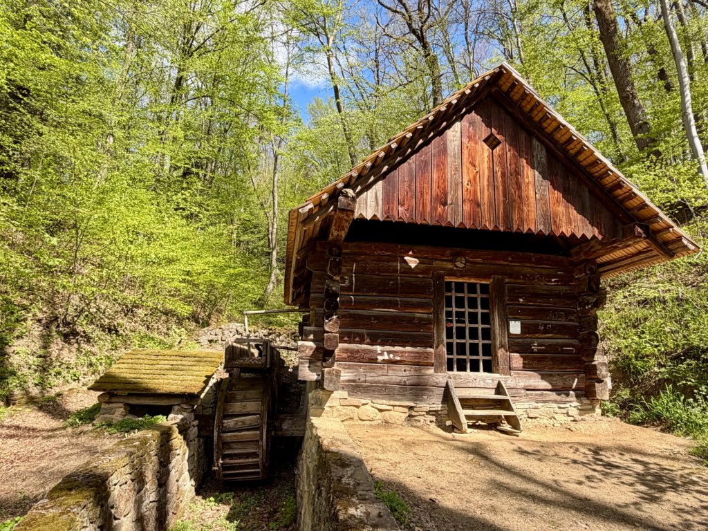 Mijamy zagrodę jednobudynkową, a potem niewielki młyn wodny, który wydaje się mały i niski, ale przyciąga uwagę swoją formą. Dalej idziemy wąwozem pod górę, gdzie las zaczyna się intensywnie zielenić, a na jego końcu pojawia się cerkiew.